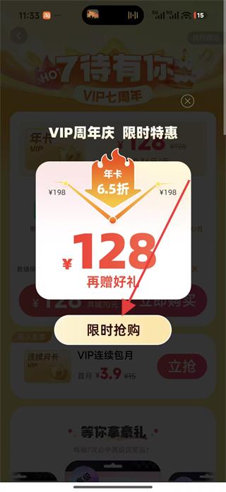 3、在VIP周年慶限時(shí)特惠的彈窗里,點(diǎn)擊限時(shí)搶購(gòu)按鈕,進(jìn)入到VIP年卡的購(gòu)買(mǎi)頁(yè)面。