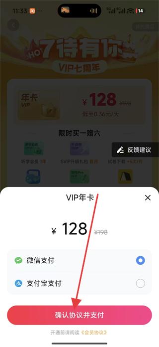4、在VIP年卡購(gòu)買(mǎi)頁(yè)面,選擇合適的支付方式,然后點(diǎn)擊確認(rèn)協(xié)議并支付按鈕,完成VIP年卡的購(gòu)買(mǎi)流程。