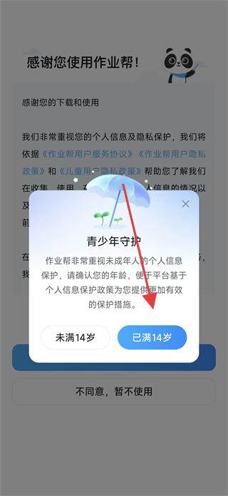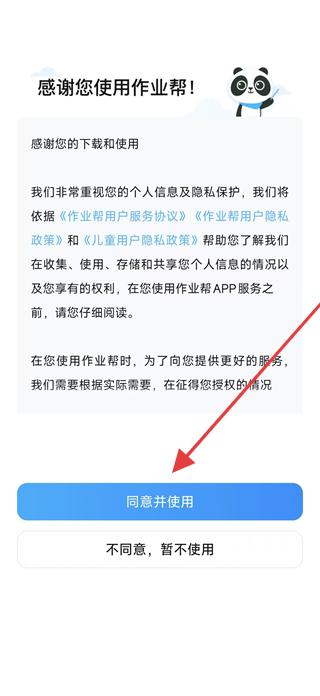 1、在感謝您使用作業(yè)幫的頁(yè)面,仔細(xì)閱讀用戶(hù)協(xié)議及隱私政策后,點(diǎn)擊同意并使用按鈕,同意作業(yè)幫的相關(guān)服務(wù)條款。