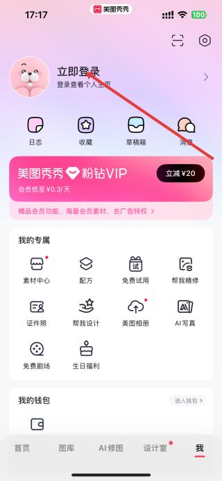 2、進(jìn)入我的頁(yè)面,可看到立即登錄、收藏等功能,以及美圖秀秀粉鉆VIP的會(huì)員推廣,點(diǎn)擊立即登錄。