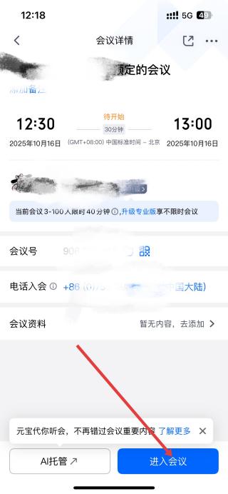 4、完成預(yù)定后,進入會議詳情頁面,能看到會議時間、會議號等信息,可添加備注、會議資料,也能點擊進入會議,開始會議。