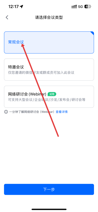 2、進入請選擇會議類型頁面,可選擇常規(guī)會議、特邀會議、網(wǎng)絡(luò)研討會Webinar等類型,選好后點擊下一步。