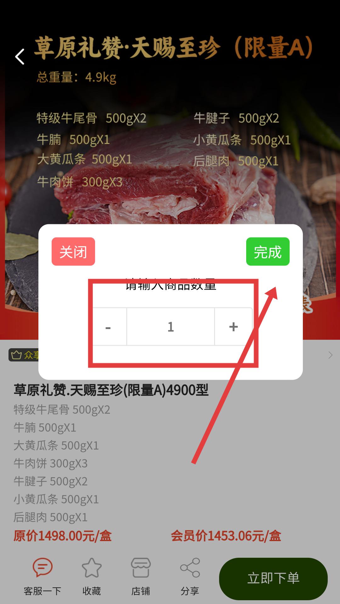 4、進(jìn)入下單流程后在彈出的商品數(shù)量選擇窗口,確定數(shù)量后,點(diǎn)擊完成按鈕,即可完成下單操作。