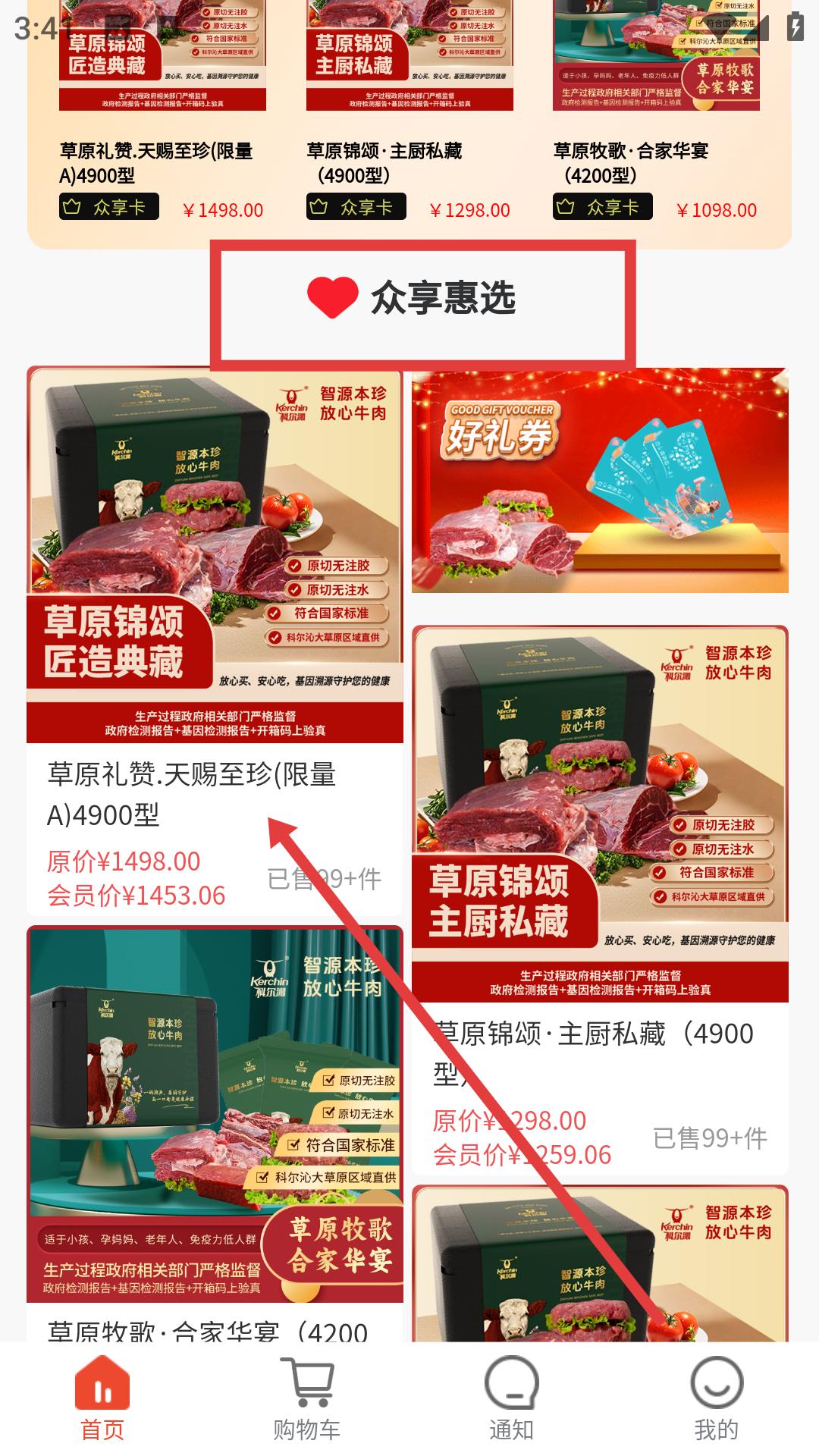 2、進(jìn)眾享惠選板塊后,瀏覽展示的各類(lèi)生鮮商品,看到牛肉禮盒點(diǎn)擊該商品,進(jìn)入商品詳情頁(yè)面。