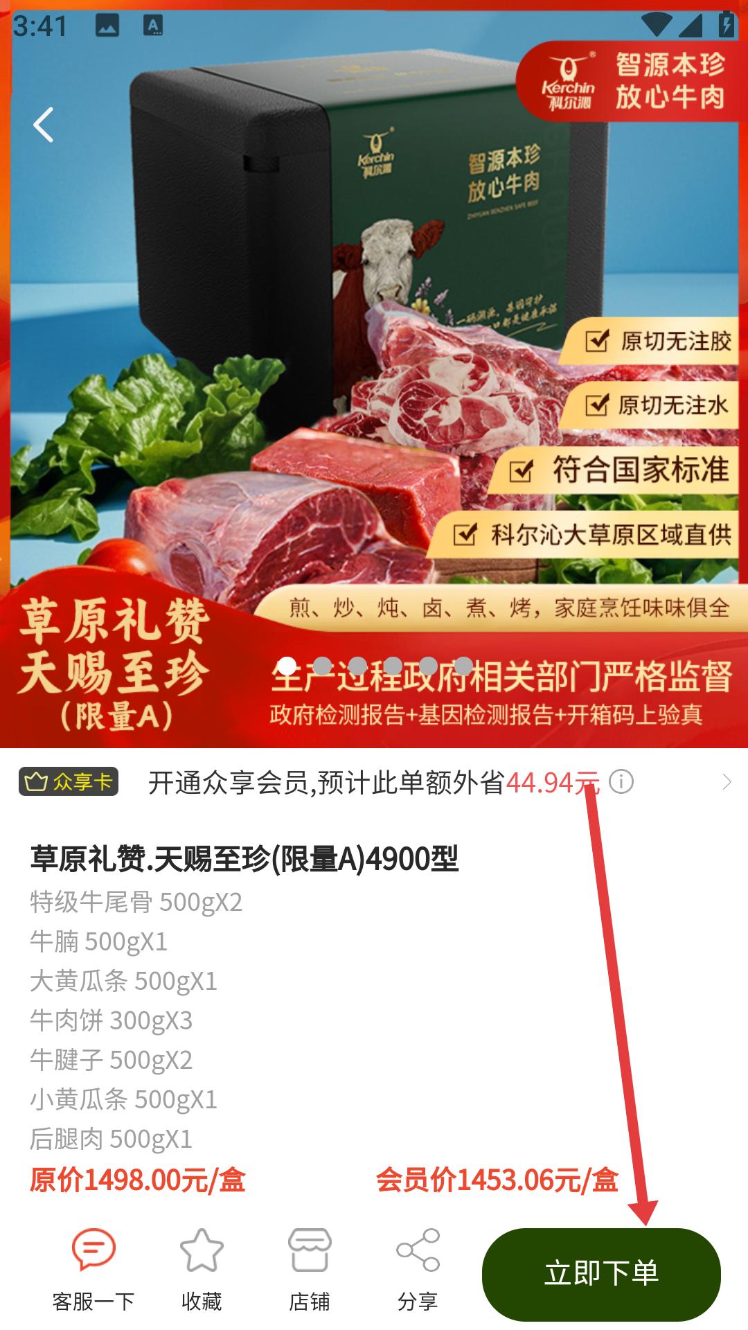 3、在商品詳情頁(yè)面查看牛肉禮盒的具體配置、價(jià)格等信息,確認(rèn)想要購(gòu)買(mǎi)后,點(diǎn)擊頁(yè)面下方的立即下單按鈕,進(jìn)入下單流程。