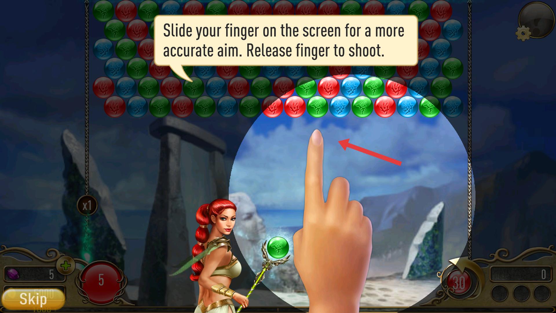 2、泡泡消除關(guān)卡中按照提示,用手指在屏幕滑動瞄準(zhǔn),松開手指發(fā)射泡泡,通過精準(zhǔn)瞄準(zhǔn)來消除同色泡泡,完成關(guān)卡目標(biāo)。