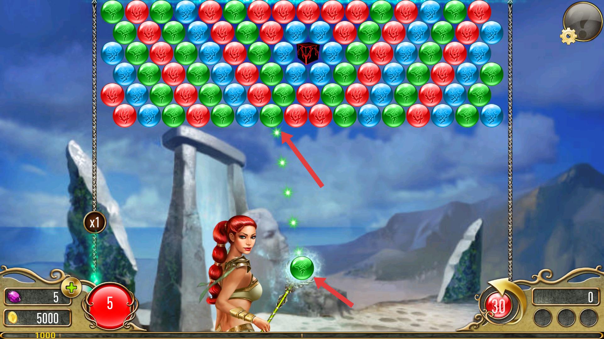 3、繼續(xù)泡泡消除,發(fā)射綠色泡泡時,瞄準(zhǔn)上方同色綠色泡泡使其相連消除,同時注意觀察泡泡布局,規(guī)劃發(fā)射路徑高效消除。