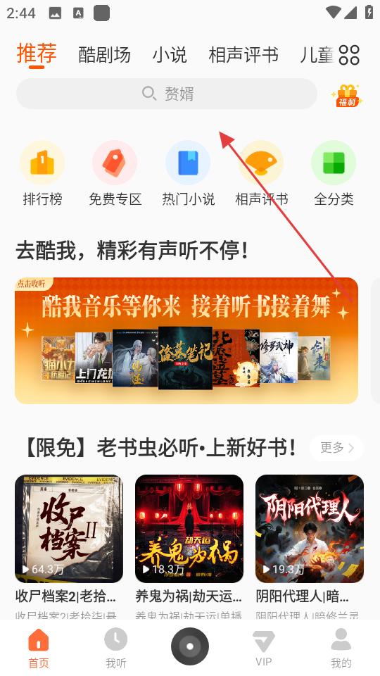 1、打開聽書APP,進(jìn)入推薦頁(yè)面點(diǎn)擊頂部搜索欄,輸入想聽內(nèi)容,如小說(shuō)、相聲評(píng)書等關(guān)鍵詞,查找對(duì)應(yīng)音頻資源。