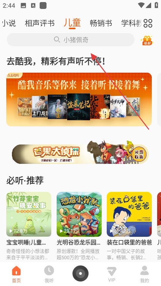 3、再切換到兒童分類,在搜索欄輸入兒童內(nèi)容關(guān)鍵詞,如小豬佩奇,查找相關(guān)兒童音頻,點(diǎn)擊播放,給孩子聽。