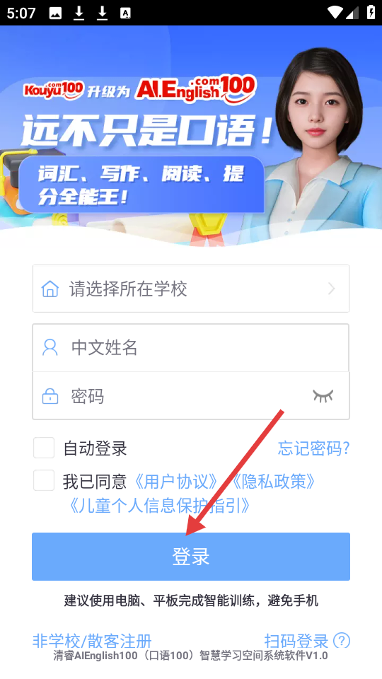 2、登錄頁(yè)面展示口語(yǔ)100升級(jí)信息,設(shè)有學(xué)校、姓名、密碼輸入欄,提供自動(dòng)登錄選項(xiàng),下方有注冊(cè)及掃碼登錄途徑。