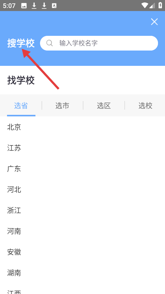 3、學(xué)校選擇頁(yè)面支持搜索和手動(dòng)篩選,搜索框可直接輸入校名,也能按省、市、區(qū)順序查找列舉多省份方便定位。