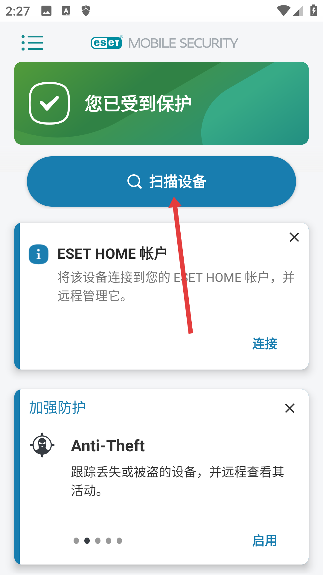 1、打開eset殺毒在主界面看到掃描設(shè)備按鈕,點(diǎn)擊它就能開啟病毒防護(hù)的核心流程,這一步會(huì)觸發(fā)應(yīng)用對(duì)設(shè)備的全面檢查,是主動(dòng)防護(hù)設(shè)備安全的基礎(chǔ)操作。