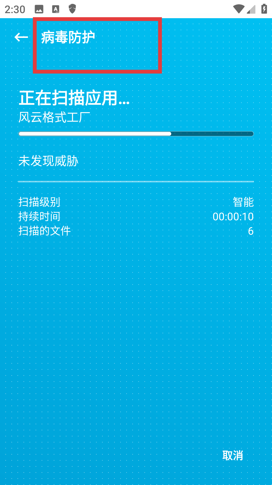 2、點(diǎn)擊掃描設(shè)備后進(jìn)入病毒防護(hù)掃描頁面,這里實(shí)時(shí)顯示掃描進(jìn)度,若發(fā)現(xiàn)威脅會(huì)及時(shí)提示,未發(fā)現(xiàn)則顯示未發(fā)現(xiàn)威脅,讓你清晰掌握防護(hù)動(dòng)態(tài),隨時(shí)了解設(shè)備安全狀態(tài)。