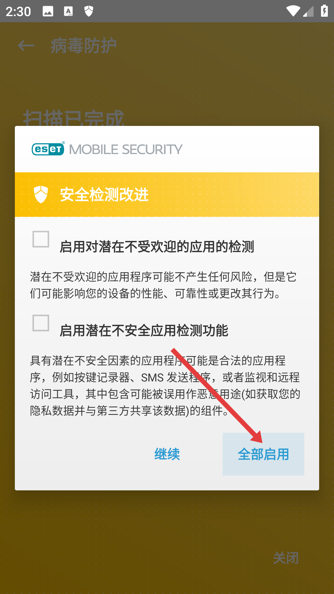 3、掃描完成或在流程中可能彈出安全檢測(cè)改進(jìn)彈窗,里面有啟用對(duì)潛在不受歡迎的應(yīng)用的檢測(cè)、啟用潛在不安全應(yīng)用檢測(cè)功能選項(xiàng),選全部啟用能讓防護(hù)更全面。