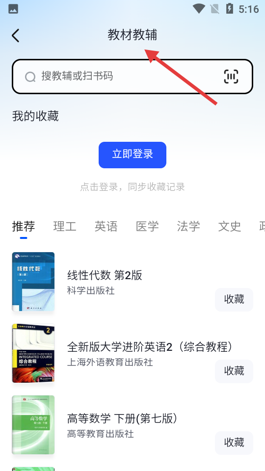 1、教材教輔平臺頁面頂部支持搜教輔與掃書碼,呈現(xiàn)理工、醫(yī)學等多領域教材登錄后可同步收藏方便管理。