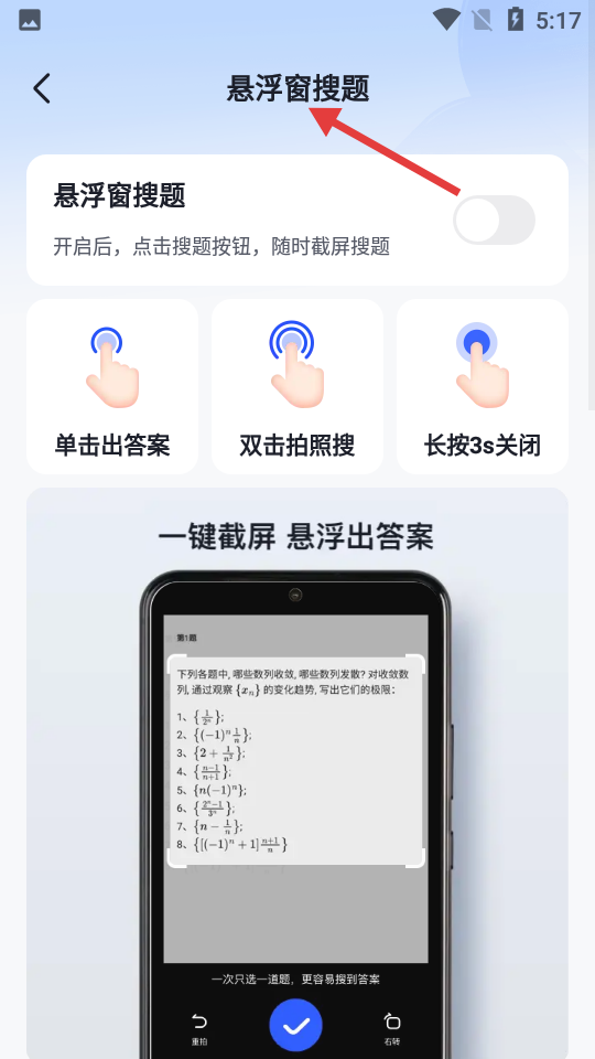 2、懸浮窗搜題功能界面,開啟后可借單擊、雙擊、長按操作搜題一鍵截屏即顯答案助力高效解題。