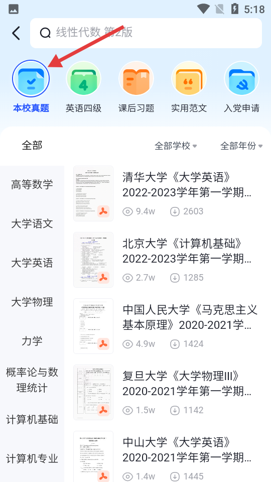 3、點擊資料搜索結(jié)果頁設有本校真題等分類,涵蓋多所高校的大學語文、計算機基礎等多學科真題資源豐富。