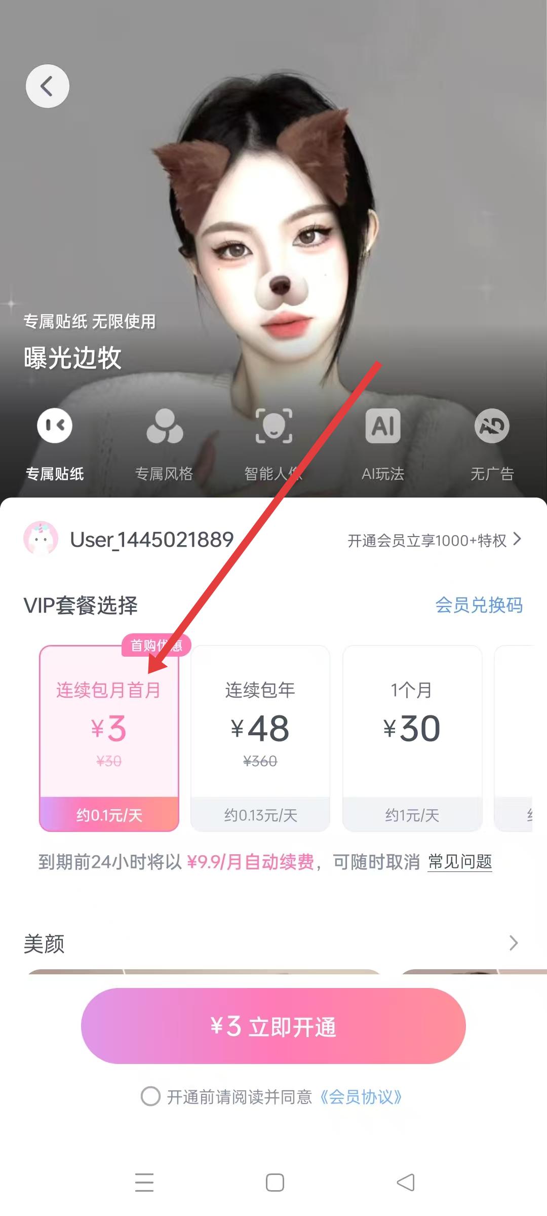 3、點擊VIP開通入口后,進入會員套餐選擇界面,可選擇連續(xù)包月、連續(xù)包年等套餐,享受專屬貼紙、無廣告等會員特權(quán)。