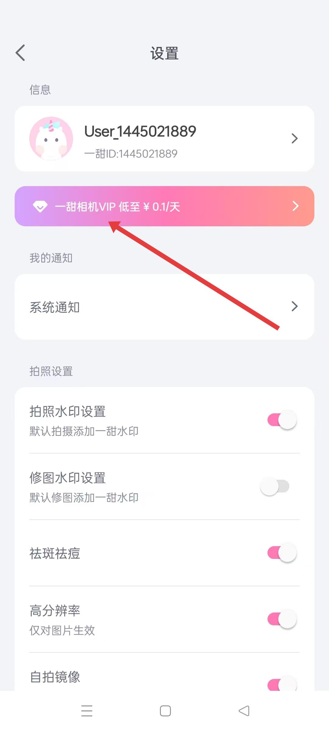 2、設(shè)置界面,可查看用戶信息,還能看到一甜相機VIP的開通入口,了解會員權(quán)益和價格信息。