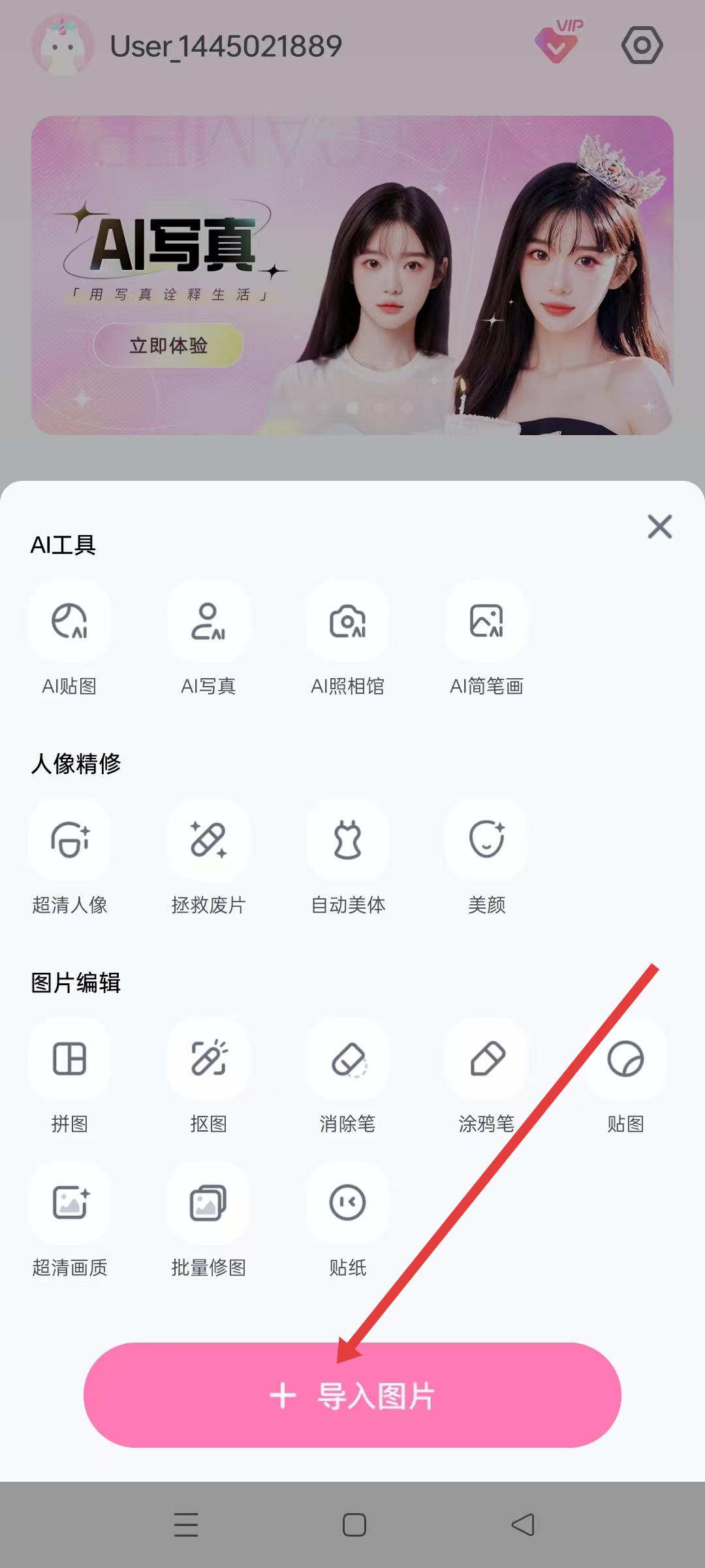 1、一甜相機APP主界面,點擊更多工具,可查看AI工具、人像精修、圖片編輯等分類功能,點擊導入圖片可開始修圖操作。