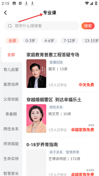 4、專業(yè)課板塊有搜索功能,分不同年齡段,課程包括家庭教育普惠工程答疑專場(chǎng)等部分課程免費(fèi)。