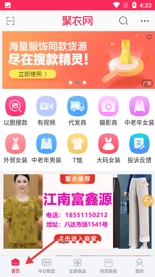 1、點擊首頁,布局豐富功能如以圖搜款、代發(fā)商等,展示廣告及商家推薦,匯聚海量服飾貨源。