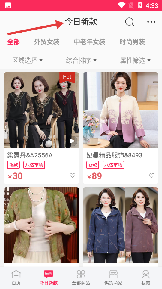 2、點擊今日新款頁面,展示外貿(mào)、中老年等多樣風格新款服裝,標注價格與市場,支持多維度篩選。