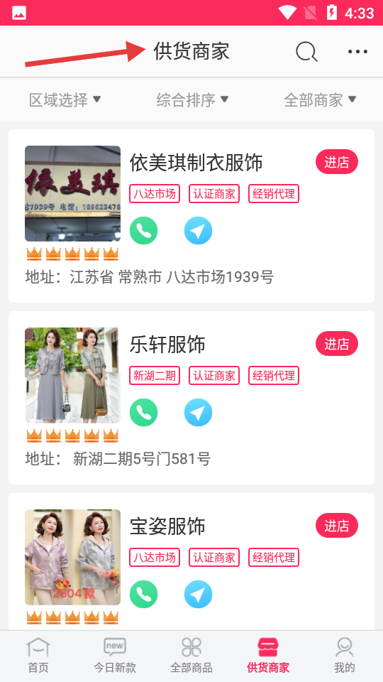 3、點擊供貨商家頁面,呈現(xiàn)認證供貨商家信息,包括名稱、地址與聯(lián)系方式,可便捷進店瀏覽洽談。