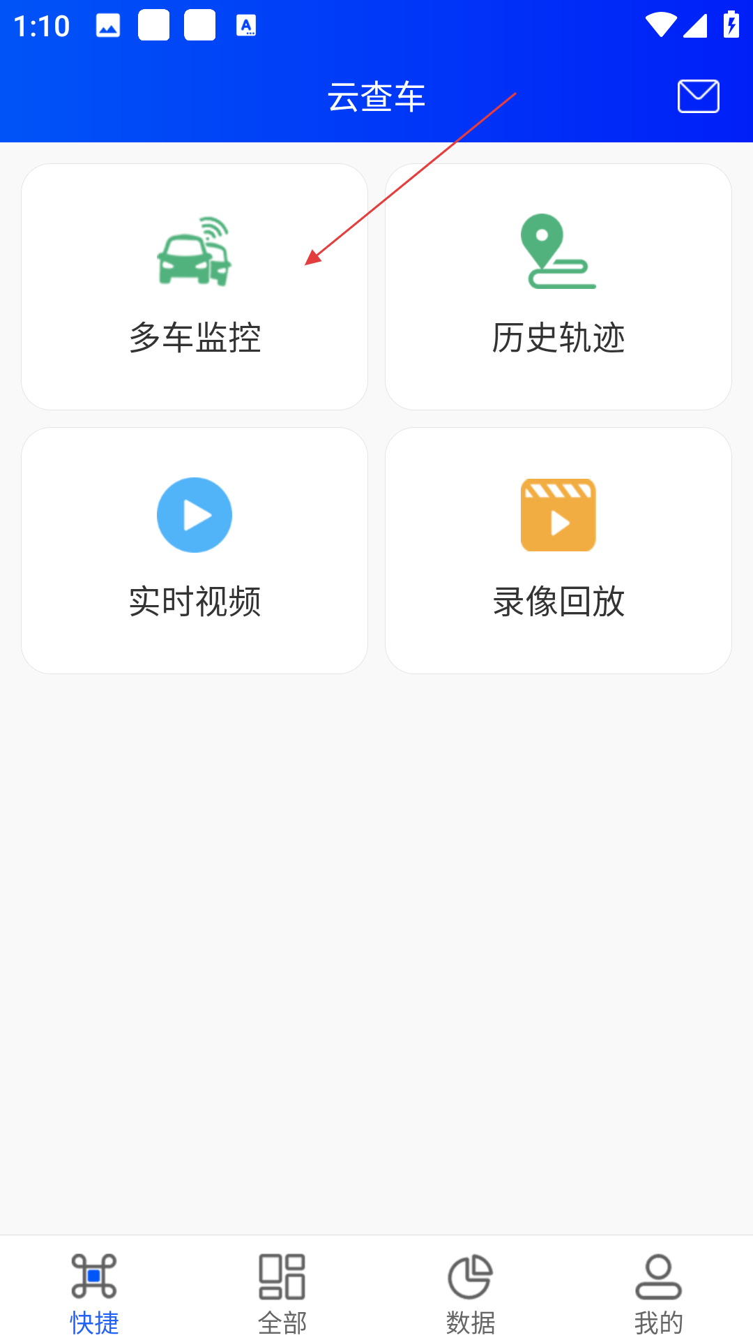 2、快捷頁面,有多個(gè)實(shí)用功能按鈕,包括多車監(jiān)控、歷史軌跡、實(shí)時(shí)視頻和錄像回放,方便用戶對車輛進(jìn)行全方位管理。