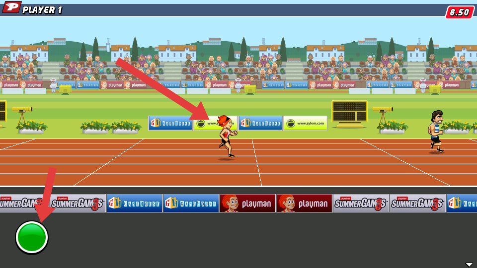 2、發(fā)令后通過點擊界面左下角綠色按鈕,控制角色在跑道上全力奔跑,向著終點沖刺,過程中需保持操作節(jié)奏。