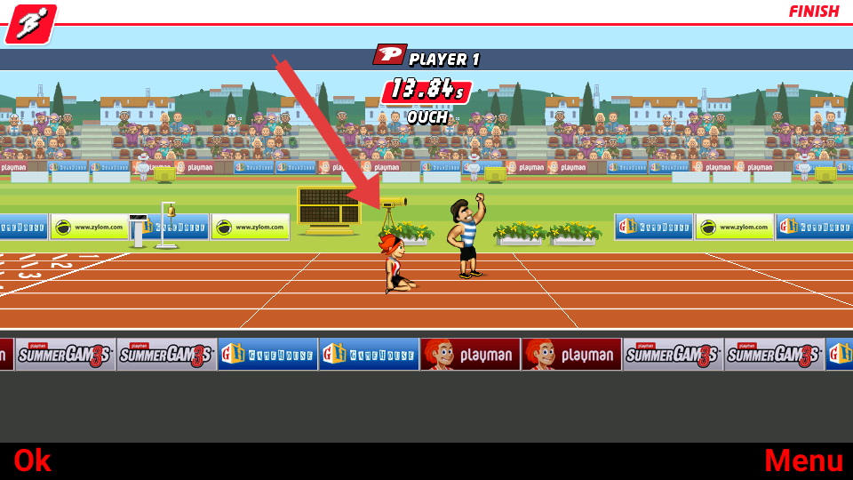 3、角色抵達終點區(qū)域,若未獲得勝利則呈現(xiàn)特定結局畫面,可選擇Ok繼續(xù)或Menu返回菜單,結束本輪競賽流程。
