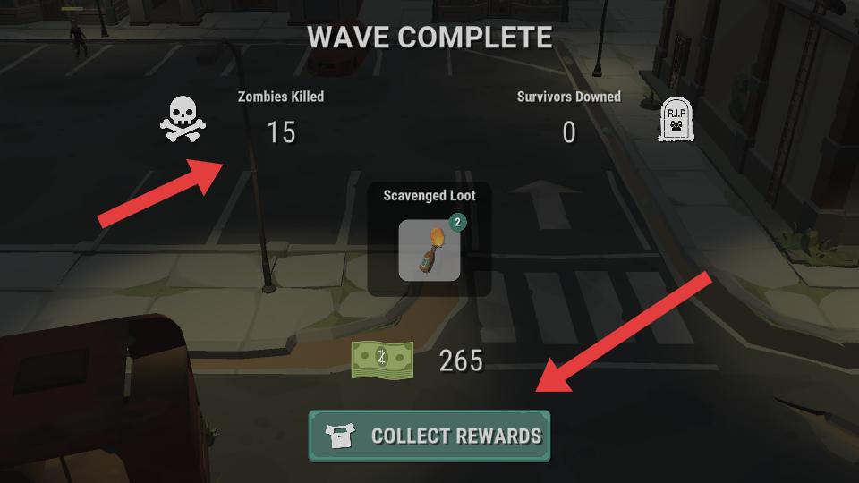 4、完成一波戰(zhàn)斗后,會顯示消滅僵尸數(shù)量等信息,獲得戰(zhàn)利品和金錢,點(diǎn)擊COLLECT REWARDS領(lǐng)取獎(jiǎng)勵(lì),繼續(xù)后續(xù)挑戰(zhàn)。