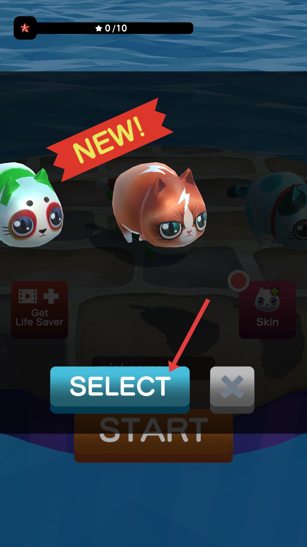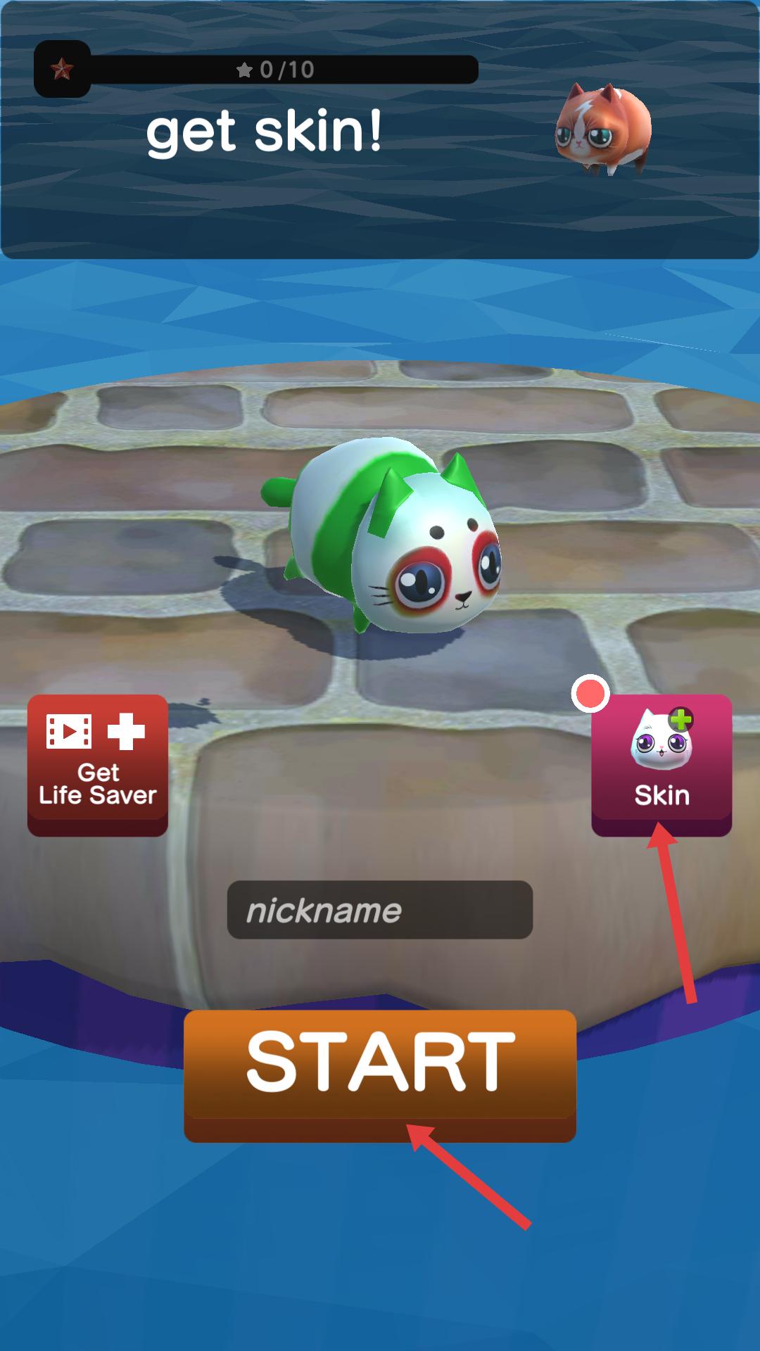 1、游戲初始界面點擊橙色的START按鈕,進(jìn)入游戲,也可點擊右側(cè)Skin按鈕更換角色皮膚,開啟游戲挑戰(zhàn)。