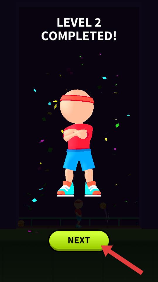 4、當(dāng)成功投進(jìn)籃筐,完成關(guān)卡2后,會(huì)顯示通關(guān)界面,此時(shí)點(diǎn)擊NEXT按鈕,進(jìn)入下一關(guān)。