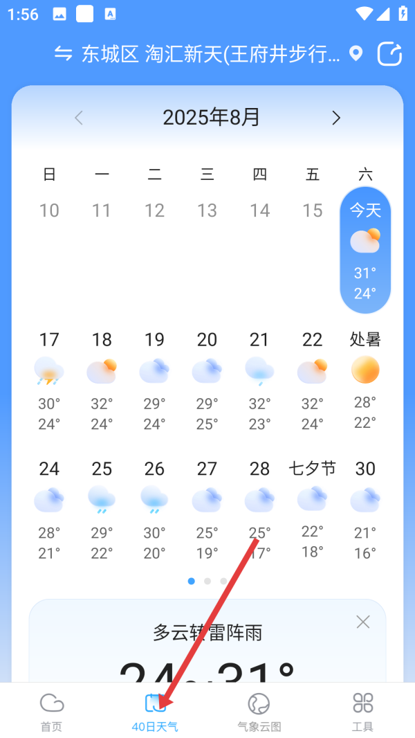 2、點(diǎn)擊40日天氣進(jìn)入日歷式天氣頁面,清晰呈現(xiàn)每日溫度、天氣狀況,便于用戶提前規(guī)劃長期行程,了解未來一個(gè)多月天氣趨勢,做足出行、生活準(zhǔn)備。
