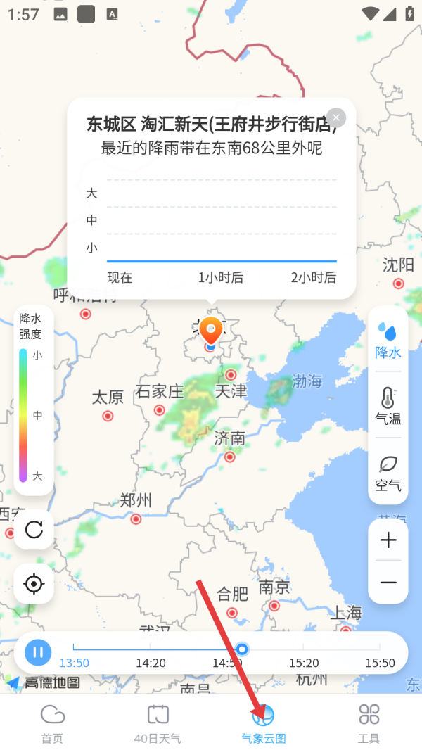 3、氣象云圖板塊地圖上顯示降水、氣溫、空氣等氣象數(shù)據(jù),定位點(diǎn)附近降雨帶位置、強(qiáng)度通過顏色和標(biāo)注呈現(xiàn),還能查看不同時(shí)段氣象變化,提升應(yīng)對天氣變化的能力。