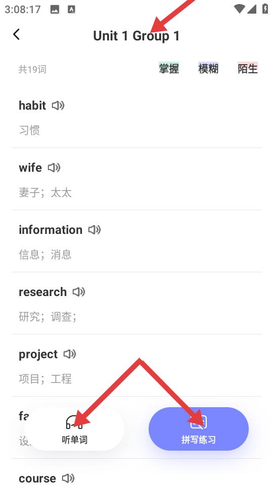 2、在聽力必考詞匯頁面Unit1下的Group1,分組按詞頻梳理詞匯,方便考生按組推進學習,清晰規(guī)劃積累節(jié)奏,穩(wěn)步攻克聽力高頻考點。