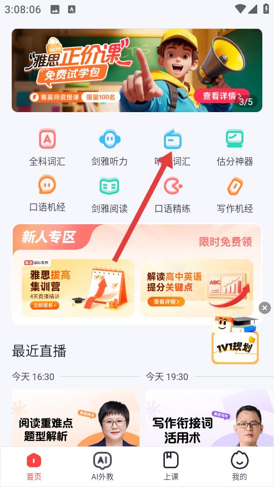 1、進入首頁找到聽力詞匯圖標并點擊,該板塊聚焦雅思聽力高頻詞匯,助力考生針對性積累核心詞,為聽力備考筑牢基礎。
