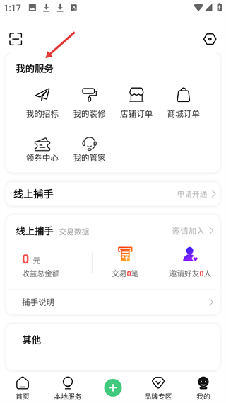 4、我的頁(yè)有我的招標(biāo)、裝修入口,可管理訂單、領(lǐng)券、找管家,查看線(xiàn)上捕手交易數(shù)據(jù)。