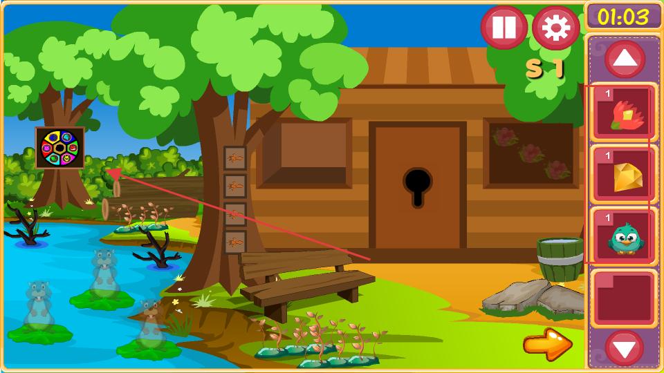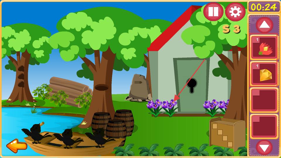 4、繼續(xù)在場(chǎng)景中探索來(lái)到木屋前,查看右側(cè)道具欄里收集到的花朵、寶石、小鳥(niǎo)等道具,選擇對(duì)應(yīng)的道具與木屋的鎖孔或周?chē)脑鼗?dòng)。