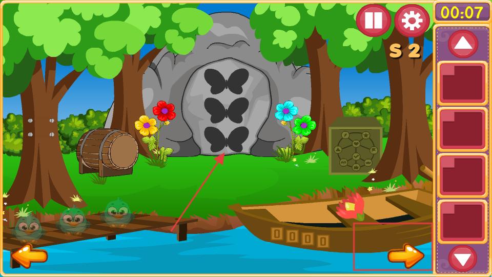 2、進(jìn)入游戲場(chǎng)景后觀察帶有蝴蝶圖案的山洞等場(chǎng)景元素,留意周?chē)哪就?、花朵等物品,嘗試與這些元素互動(dòng)尋找線索。