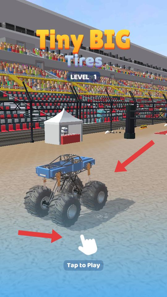 1、進(jìn)入游戲,能看到巨型輪胎的藍(lán)色越野車,界面有Tap to Play提示,點(diǎn)擊后即可操控越野車在賽道上行駛,開啟游戲。