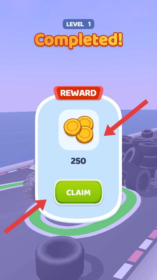 2、成功完成關(guān)卡后,會出現(xiàn)Completed提示,還有標(biāo)有REWARD的獎勵彈窗,顯示250金幣,點(diǎn)擊CLAIM可領(lǐng)取獎勵。