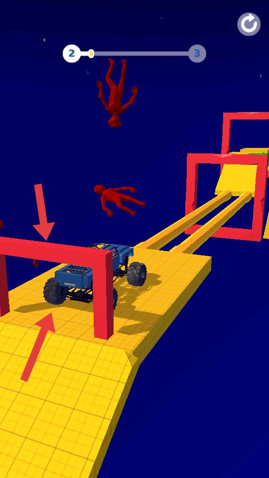 3、在賽道上,要操控越野車穿過紅色框架等障礙,同時(shí)避開空中掉落的紅色人形物體,順利前行推進(jìn)游戲進(jìn)程。