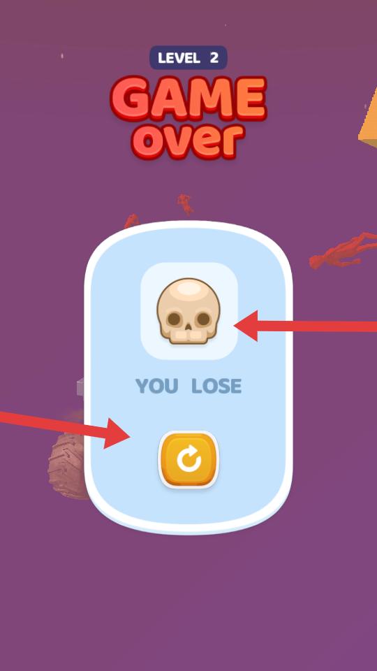 4、若游戲失敗,會出現(xiàn)GAME OVER提示,界面有骷髏頭和YOU LOSE字樣,點(diǎn)擊下方重新開始按鈕,可再次挑戰(zhàn)關(guān)卡。