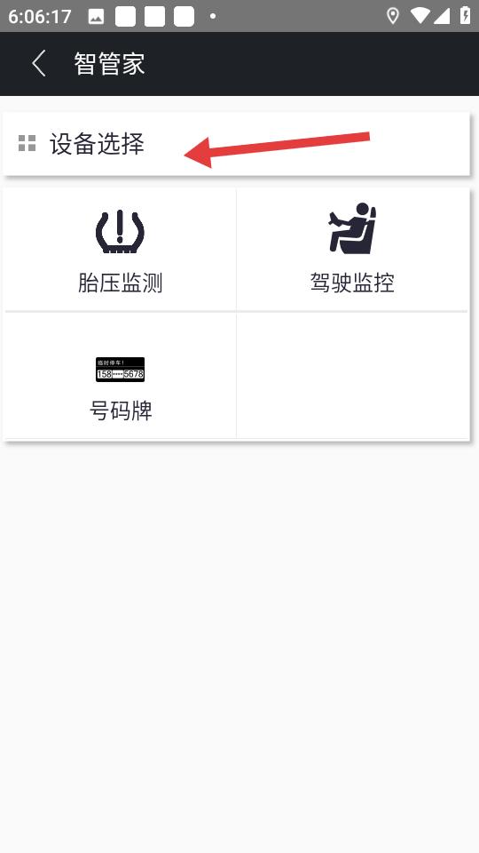 2、智管家頁面提供設(shè)備選擇入口,涵蓋胎壓監(jiān)測、駕駛監(jiān)控、號碼牌設(shè)置等模塊,用戶可快速進入對應(yīng)功能管理車載設(shè)備,助力構(gòu)建個性化智能駕駛體驗。