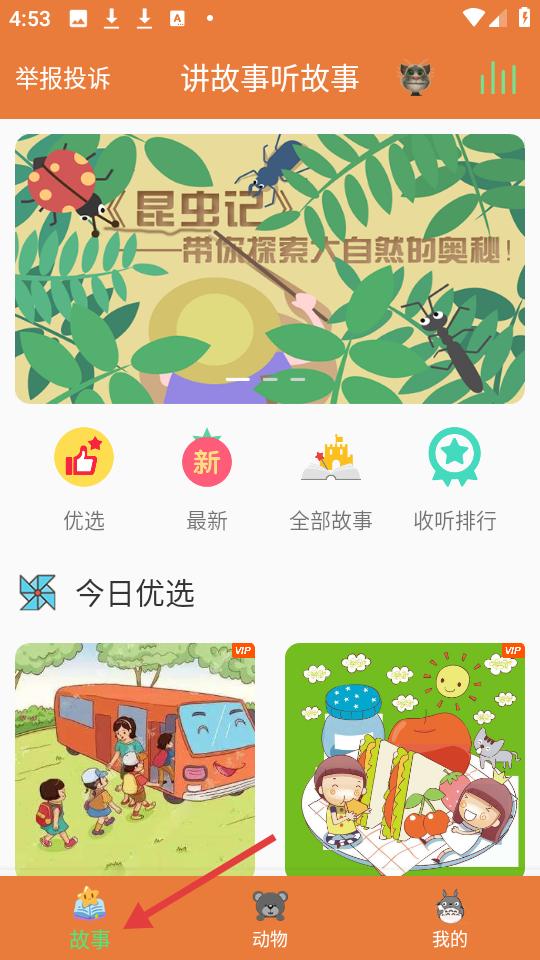1、點(diǎn)擊故事主頁,以橙色為主色調(diào),頂部有昆蟲記宣傳,設(shè)有優(yōu)選、最新等分類,呈現(xiàn)今日優(yōu)選故事。