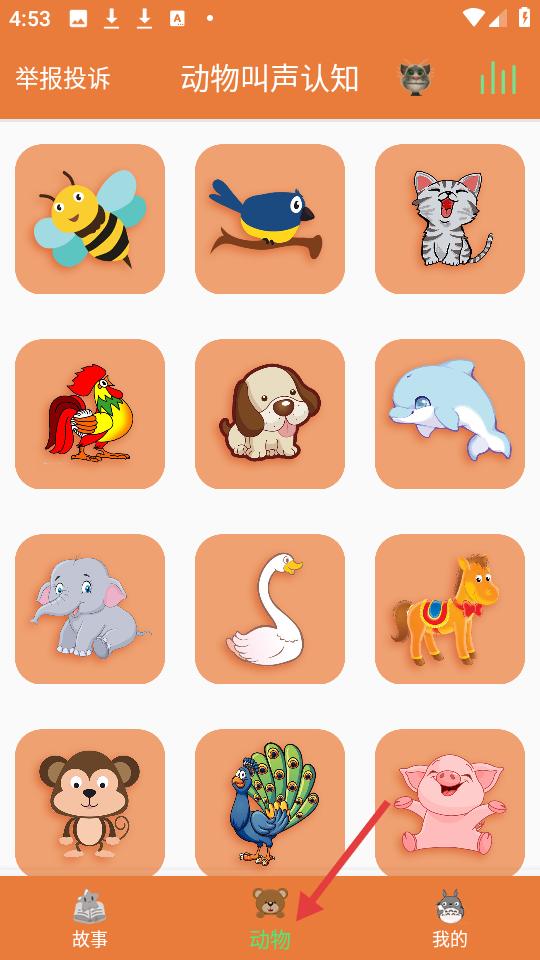 2、點(diǎn)擊動(dòng)物叫聲認(rèn)知頁面,布滿可愛動(dòng)物圖標(biāo),如蜜蜂、小鳥等,方便孩子認(rèn)知不同動(dòng)物及其叫聲。