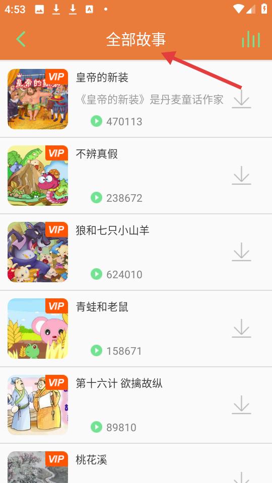 3、點(diǎn)擊全部故事頁面展示豐富故事資源,像皇帝的新裝等,標(biāo)注VIP標(biāo)識(shí)與播放量,滿足孩子收聽需求。