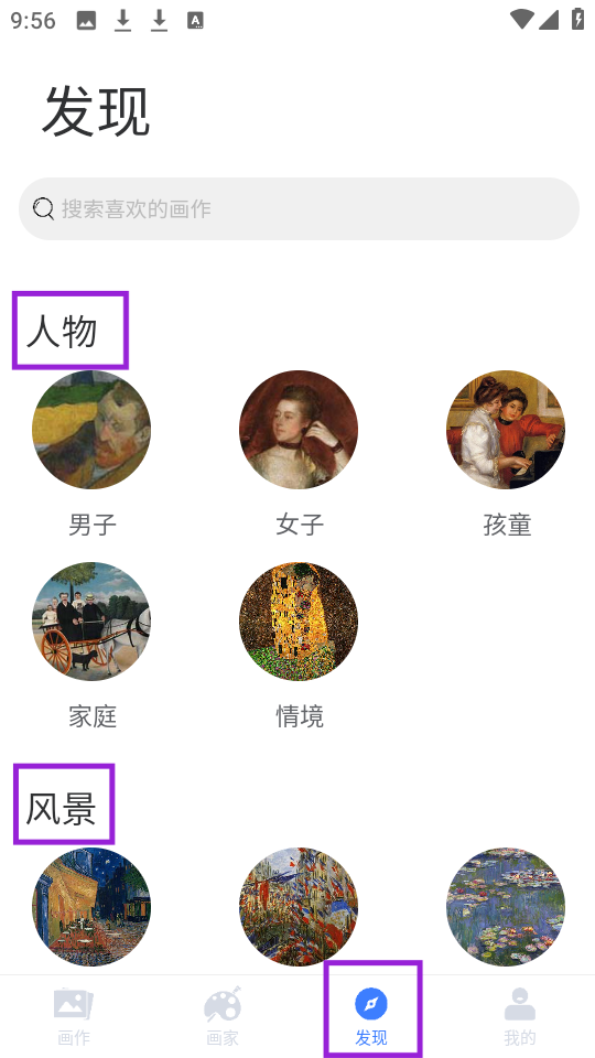 1、藝術(shù)APP的發(fā)現(xiàn)頁,分人物風(fēng)景板塊人物細(xì)分為男子、女子等,助用戶精準(zhǔn)探尋心儀畫作主題。